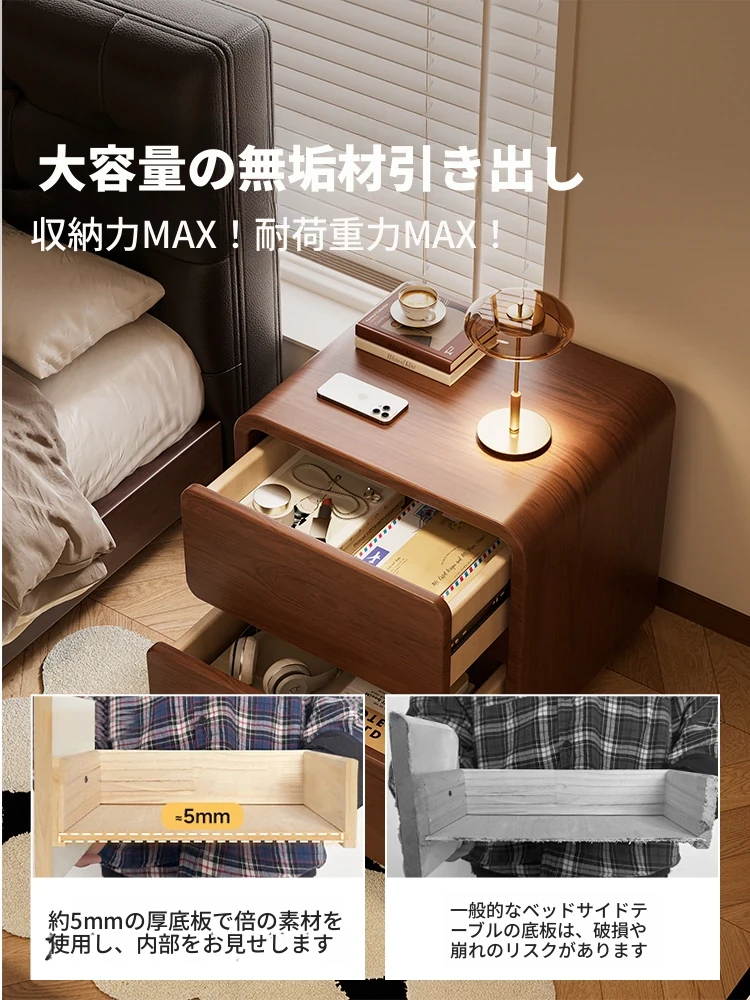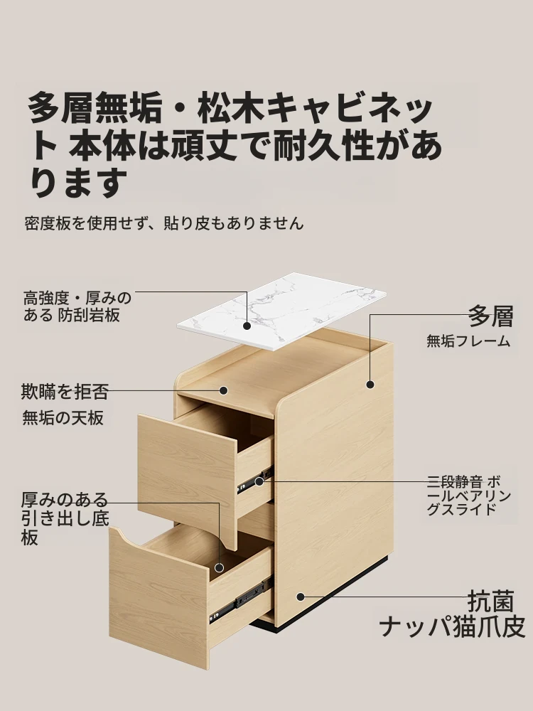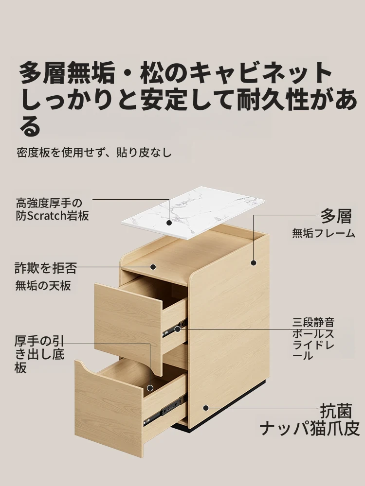 高級感溢れるシンプルな無垢材ベッドサイドテーブル!コンパクトで収納力抜群、現代的なデザインでお部屋をスタイリッシュに演出。岩板仕上げで、心地よい寝室空間を実現。