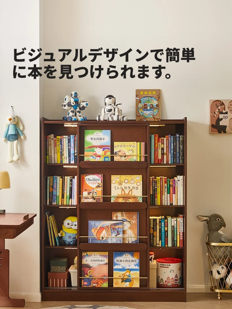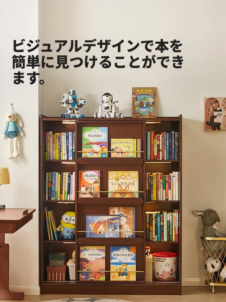 子供向け多層本棚!実木製で耐久性抜群、プッシュプルドア付きの収納キャビネット。壁にぴったりフィットし、おもちゃや絵本をスッキリ収納!お部屋をおしゃれに彩る機能的なアイテムです。