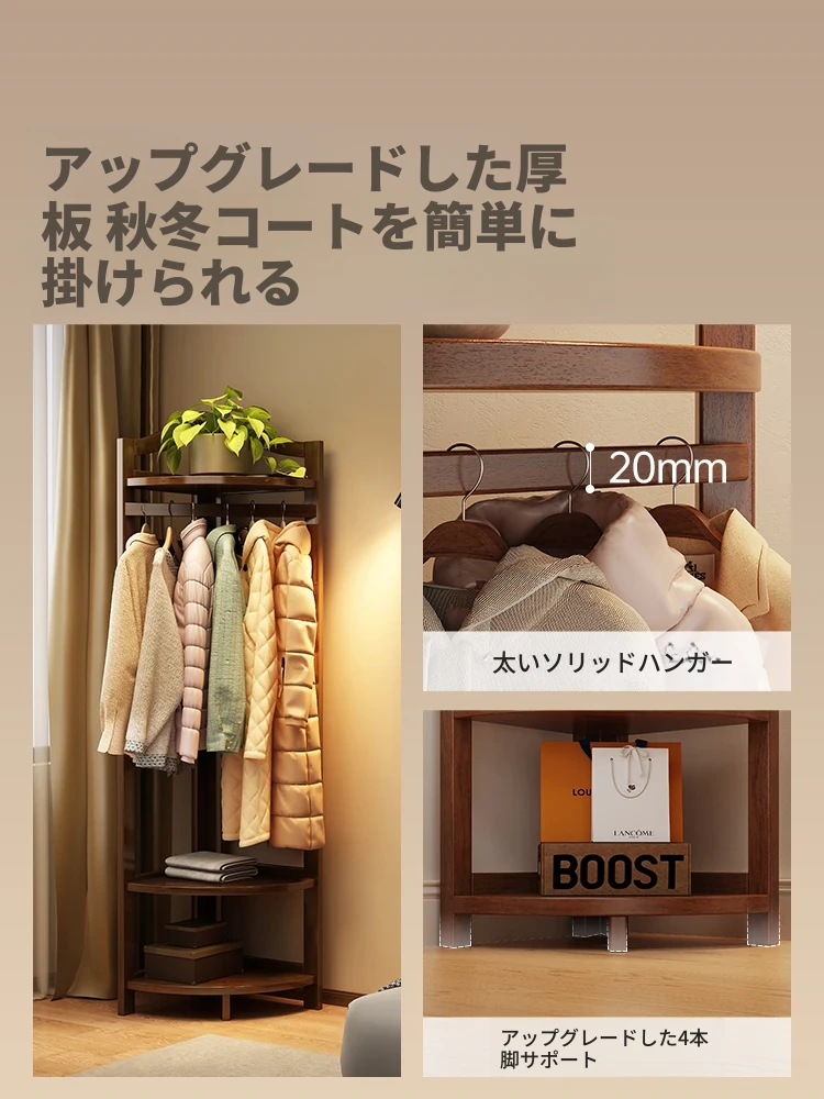 実木製のスタンドハンガー - 寝室やベッドサイドに最適な衣類収納!省スペースでスマートに衣服を整理。角の空間を有効活用し、夜のお洋服もスッキリ。おしゃれで便利なアイテムを手に入れよう!