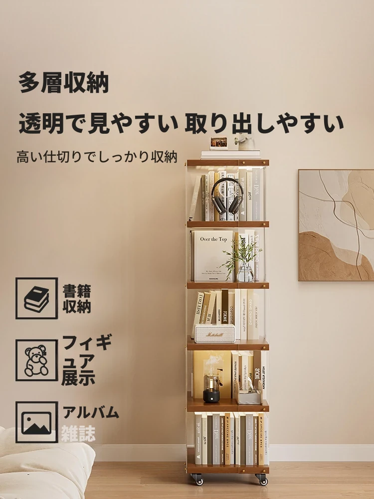 360度回転アクリルブックシェルフ - 木製学生用収納キャビネット、移動可能なフロアスタンド式多段ラックで、お部屋をスタイリッシュに整理整頓!