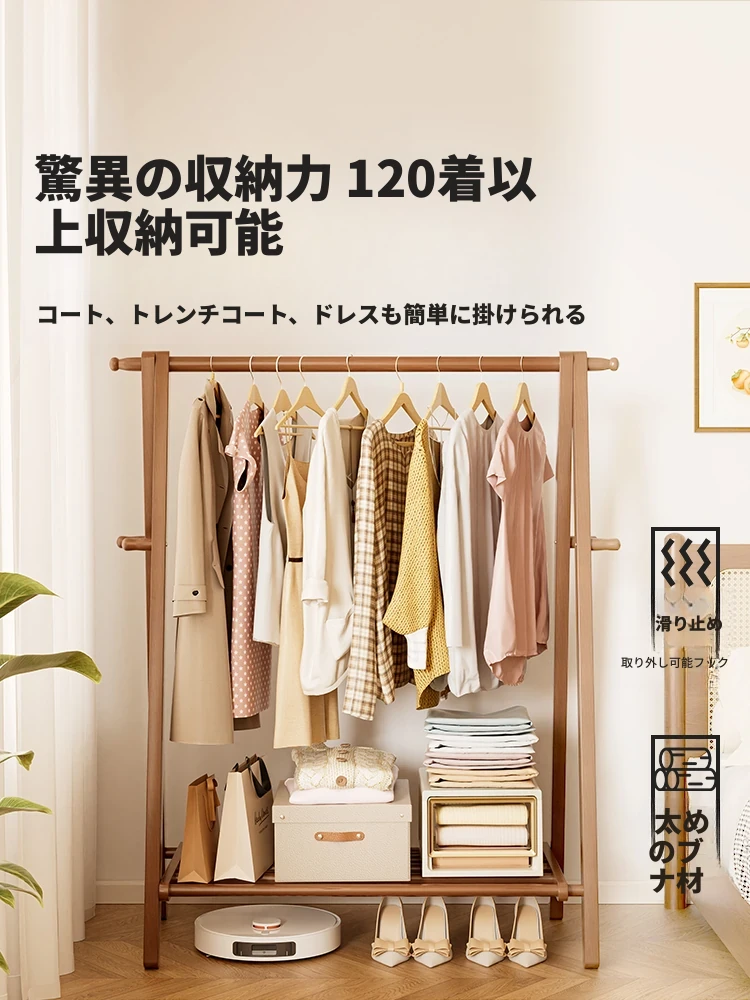 移動式実木ハンガーラック - 家庭用玄関や子供部屋に最適!キャスター付きで簡単移動、収納力抜群の多目的ラック。おしゃれで機能的な収納を実現します!