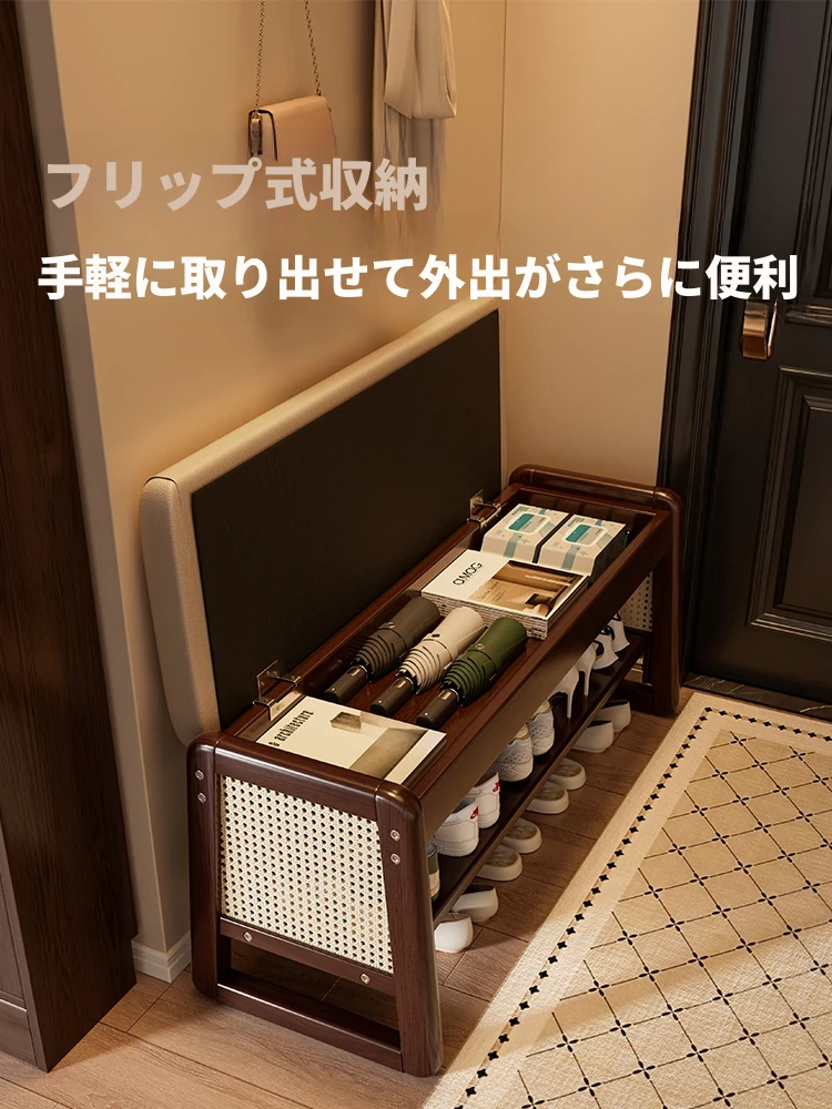 高級感溢れる無垢材スリムシューズベンチ - 玄関にぴったり!収納機能付きで、座ることもできるスタイリッシュなデザイン。狭いスペースにもフィットする、中古風の洗練されたシューズベンチ。