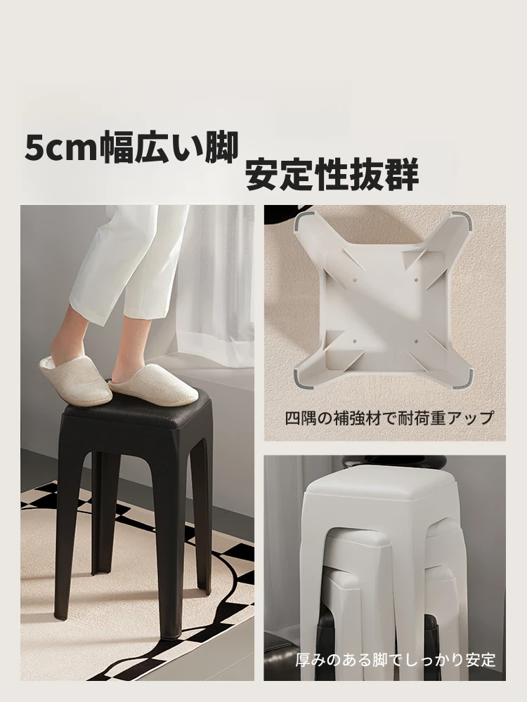 厚手で丈夫なプラスチック製ソフトパッキングスツール!家で使えるスタイリッシュなデザイン、重ねて収納可能で省スペース!モダンなリビングやダイニングにぴったりの補助椅子です。