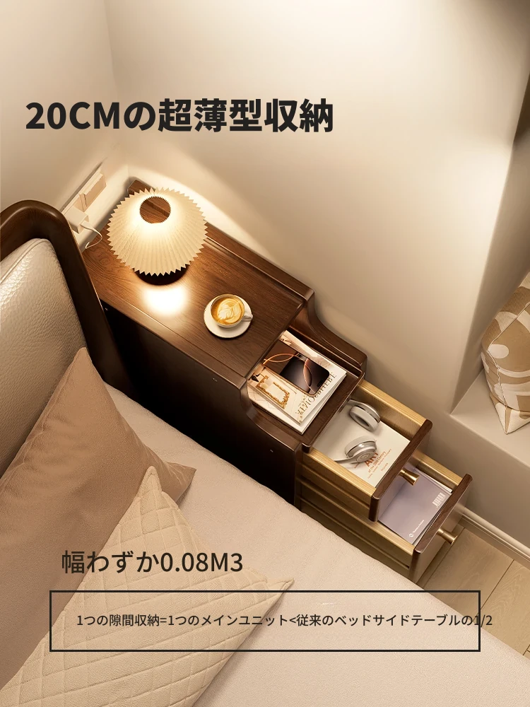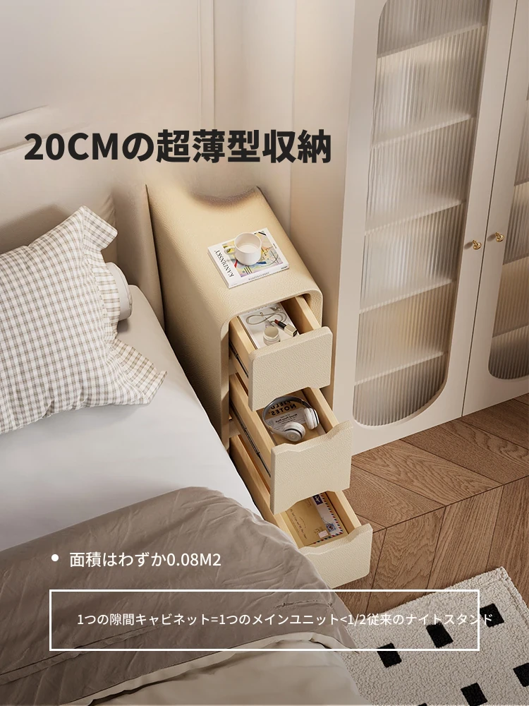 超コンパクトなナローヘッドボードキャビネット - 天然木製クリーム色仕上げ!お部屋の隙間にぴったりフィットする20cmのミニ収納キャビネット。スタイリッシュで機能的なデザインで、あなたの寝室をおしゃれに演出します!