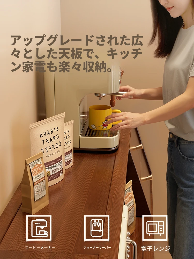 ウォールサイド一体型無垢材ダイニングサイドキャビネット - リビングやキッチンに最適な収納力!コーヒーメーカーも置けるおしゃれな置物棚。シンプルでスタイリッシュなデザインで、お部屋をスッキリ整理!
