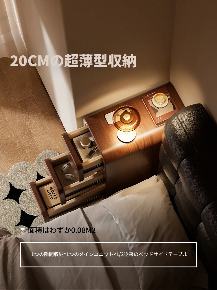 実木製超スリムベッドサイドキャビネット - 小型・ミニ収納ラックで、お部屋をスッキリ整理!幅20cmの極薄デザインで、限られたスペースにもぴったりフィット!