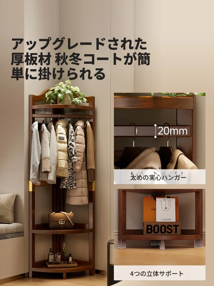 玄関用コーナーコートラック - 家庭用のスタイリッシュな立式ハンガー!寝室や部屋の隅にぴったりフィットし、ベッドサイドや壁の隅に置ける便利な収納家具です。おしゃれに衣類を掛けて、スペースを有効活用しましょう!