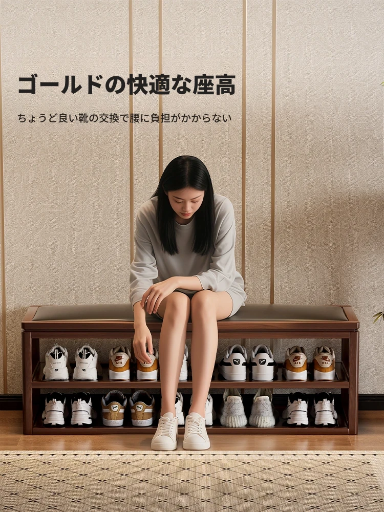 玄関用実木スリッパベンチ - スタイリッシュなデザインで靴を履く時も快適!収納付きで、シューズキャビネットとしても活躍する一体型の長椅子。家の入り口をおしゃれに演出し、毎日の暮らしを便利にします!